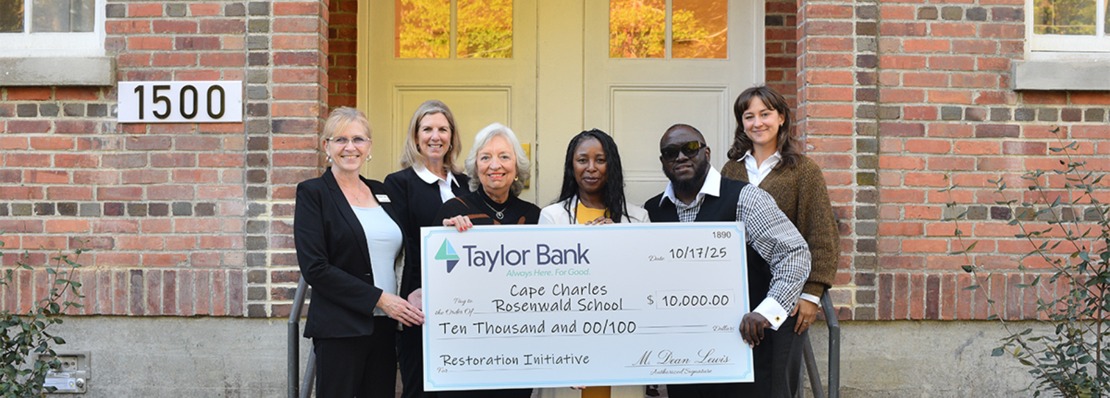 CAPE CHARLES, VA (October 22, 2025) – Taylor Bank has pledged $10,000 to the Cape Charles Rosenwald School Restoration Initiative (CCRSRI) to support the Impact Center, a vibrant community hub where the Eastern Shore community gathers to learn, play and prosper. The donation will help launch relevant, purposeful and innovative community programs in Cape Charles, Virginia. The Impact Center features a classroom space for lectures, and training. One of the users of this space is the Eastern Shore Community College who will provide a convenient location to Lower Shore residents.  The space is equipped with state-of-the-art two-way video, workforce training facilities, business incubator space, a commercial kitchen, and flexible meeting and event areas that provide and an opportunity to tell the history of the school and other topics through exhibits. The rehabilitated school will serve as a vital resource for partnerships, lifelong learning, and economic opportunity, addressing critical needs on the Eastern Shore.